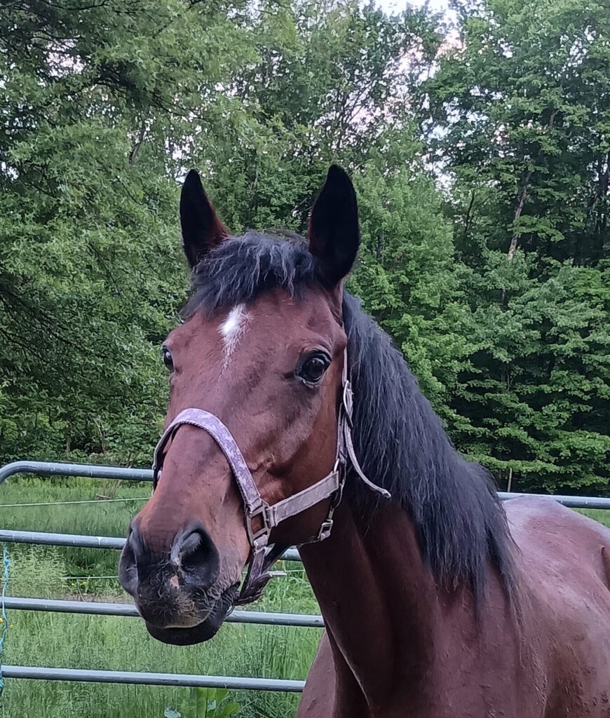 Mikey – Mikey originally came to us as an unhandled 2 year old thoroughbred colt. We did all of his veterinary work and worked on socialization and groundwork. He was adopted and sent to SUNY Morrisville for training. He was returned some time later, and was adopted again on June 17th, 2025.